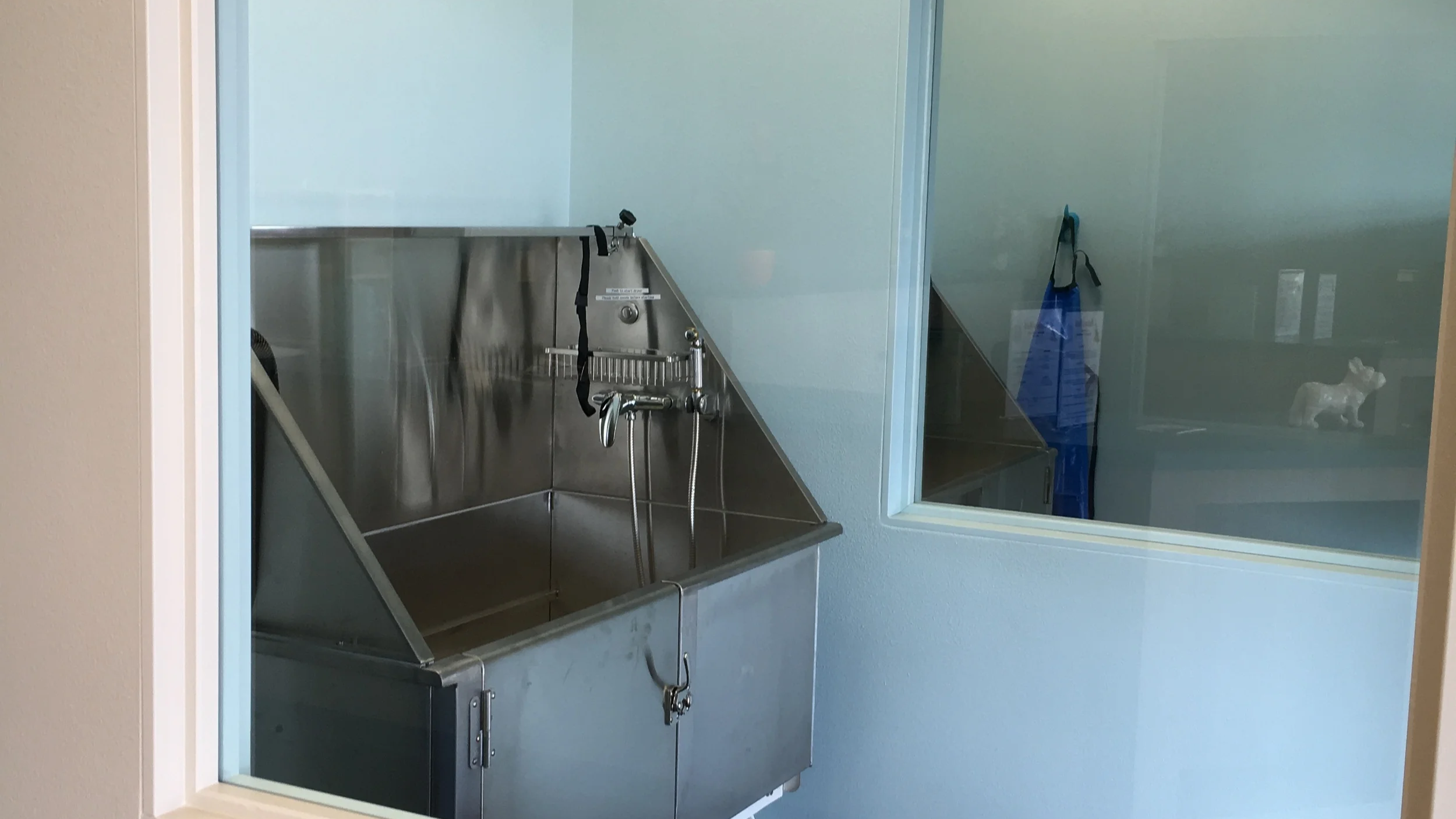 Premium shampoo, conditioner, ear cleaner, grooming tools, blow dryer and towels. Self-wash tubs are raised for the handler's comfort.
